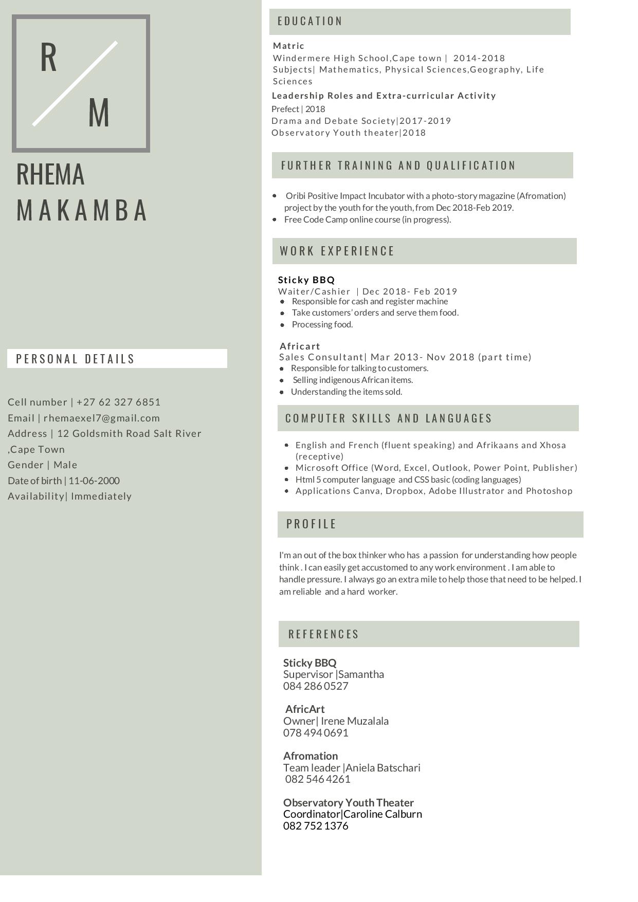 My full name is Rhema Makamba Exel Mayele, I'm originally from the DRC (Democratic republic of Congo) moved to South Africa when I was four. I have connected with people of different cultures and religions so I'm know not to assume things about people.I'm Loud and outspoken and very artsy. like understanding how things work no matter the size or functionality. Crazy about nature and people.